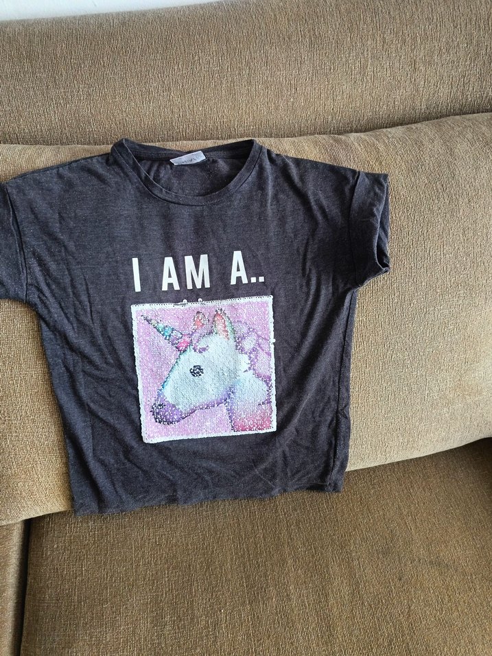 Gri pamuklu, kısa kollu, yuvarlak yakalı, bol kesim kız çocuk tişörtü. Payetli unicorn baskısı ve "I AM A.." yazısı bulunur.