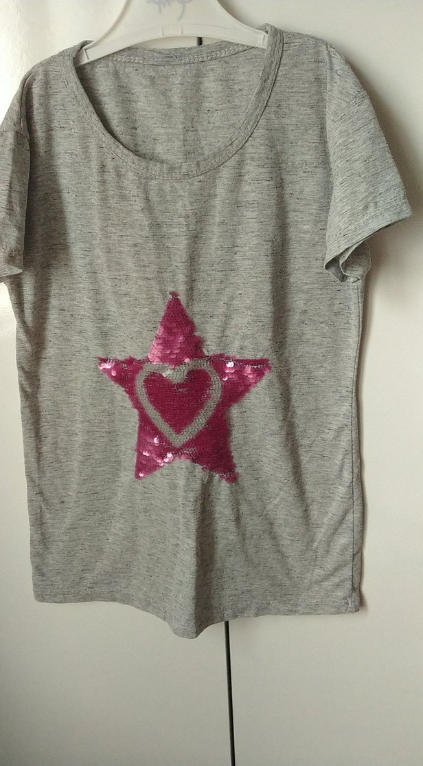 Gri renkli, kısa kollu, yuvarlak yaka kız çocuk tişörtü. Simli pembe yıldız ve kalp baskısıyla, bol kesimdir. Trendy ve rahat bir seçenek. ⭐