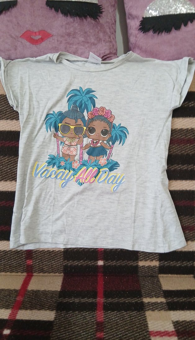 Kız çocukları için kısa kollu, yuvarlak yakalı ve bol kesim tişört. Pamuk kumaştan, gri renkte, baskılı figürler ve dantel detaylıdır. Rahat sokak stili için uygundur.