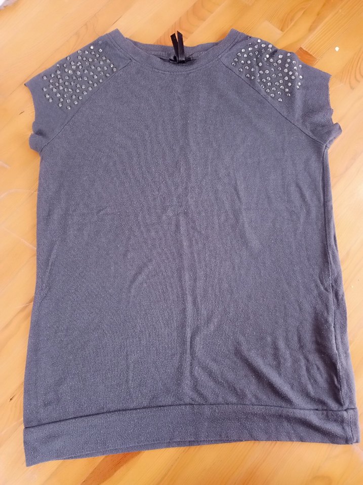 Gri renkli kız çocuk tişörtü, yuvarlak yaka ve kısa kollu olup omuzlarında zarif süslemeler bulunur. Pamuk kumaştan üretilmiş, rahat sokak stili için geniş kesimlidir.