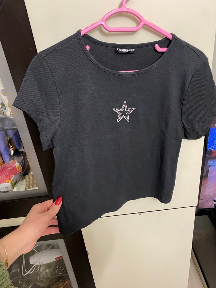 Gri, kısa kollu, dar kesim tişört. Yuvarlak yaka ve baskılı yıldız deseni bulunur. Düğme detayı ve denim görünümlü kumaştan yapılmıştır.