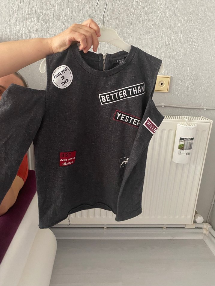 Kız çocukları için dar kesim, uzun kollu, yuvarlak yaka gri tişört. Baskılı yamalar ve cırt cırtlı detaylar içerir. Tekstil malzemeden üretilmiştir, trend sokak stili için uygun. ✨