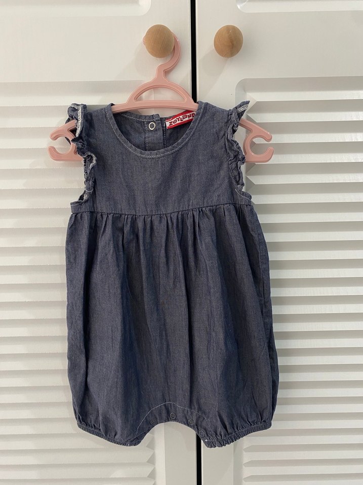Kız çocuklar için gri kolsuz denim tulum, omuzlarda fırfır detayları ve rahat bir kullanım için bol kesime sahiptir. Desensiz sade tasarım.