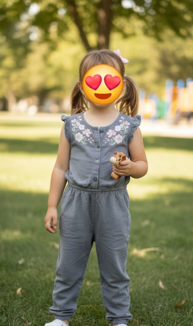 Kız çocuklar için kolsuz, gri denim tulum. çiçek desenleri ve düğmeli kapanışa sahip, rahat bol kesim. ince kot kumaş