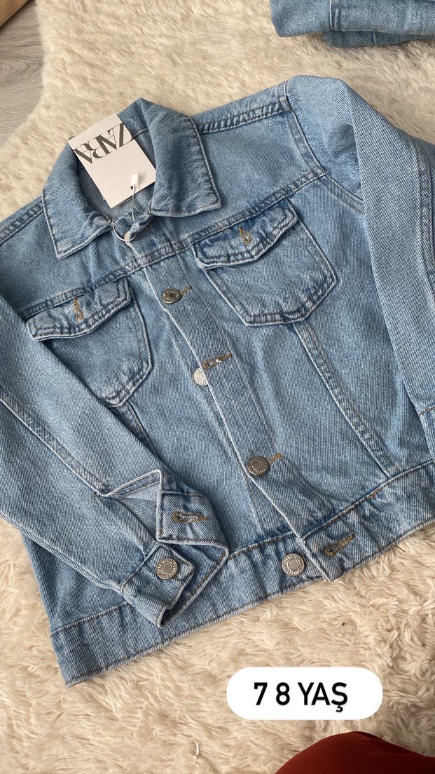 Kız çocukları için düğmeli, notlu yakalı, bol kesim mavi kot ceket. Trend sokak stili için ideal ve desensiz tasarım.
