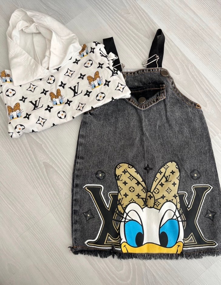 Gri kot kumaş, straplez yaka ve bol kesim kız çocuk elbisesi. Baskılı ve payetli detaylarla trend sokak modası tarzında.