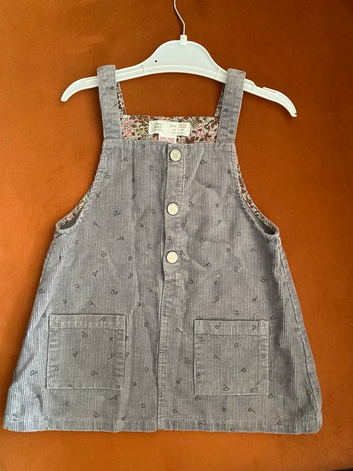 Düğmeli, nakışlı detaylara sahip, askısız ve bol kesim gri kot kız çocuk elbisesi. Tertemiz
