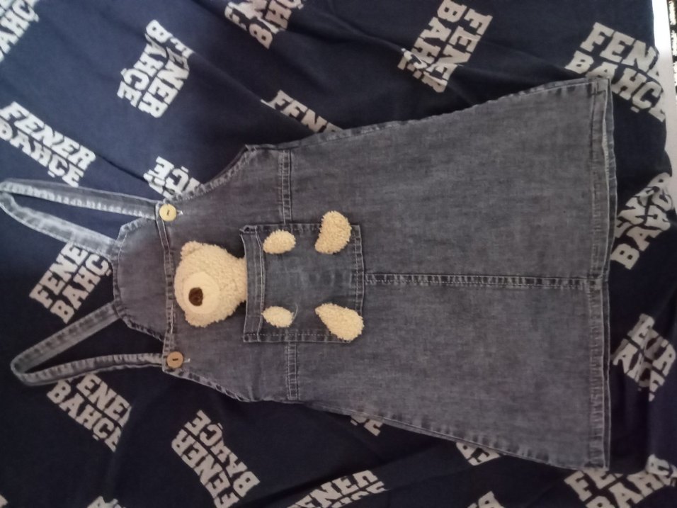 Düğmeli askılı, bol kesim gri kot kız çocuk salopeti, ön cepte ayıcık detaylı. Sokak stili için uygun.