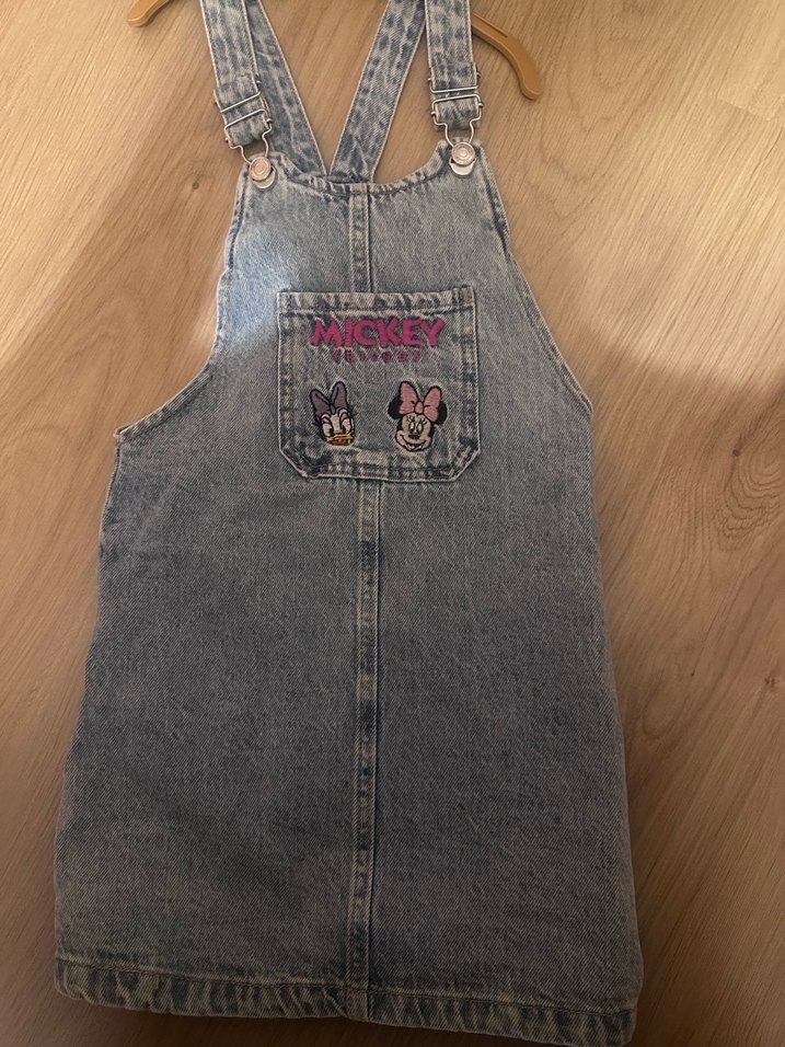 Askılı, fitted kesim gri kot elbise, ön cepten işleme Mickey ve Minnie desenli, tokalı detaylı, günlük tarzda.
