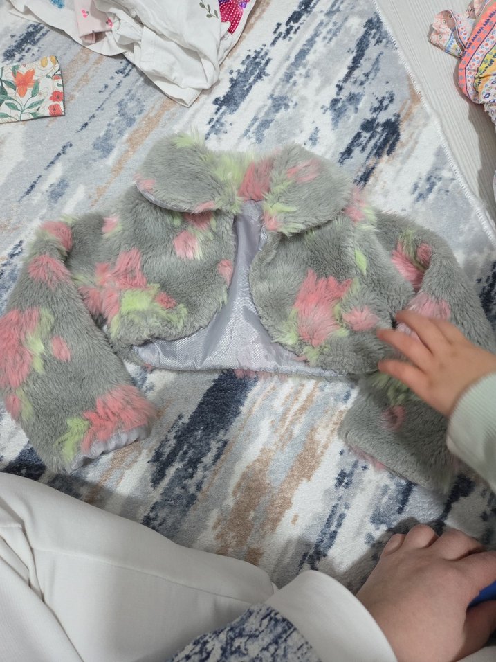 Gri tie-dye desenli, kürk detaylı, sentetik kumaştan uzun kollu ve straplez yaka, bohem tarzda kız çocuk bolero.