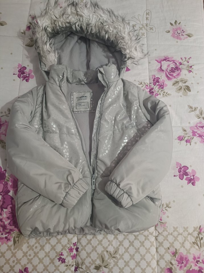 Kız çocukları için gri, kürklü kapüşonlu ve işlemeli desenli, yumuşak ve sıcak fleece kumaştan yapılmış dar kesim mont. Trendy ve rahat sokak stili için uygundur. ❄️
