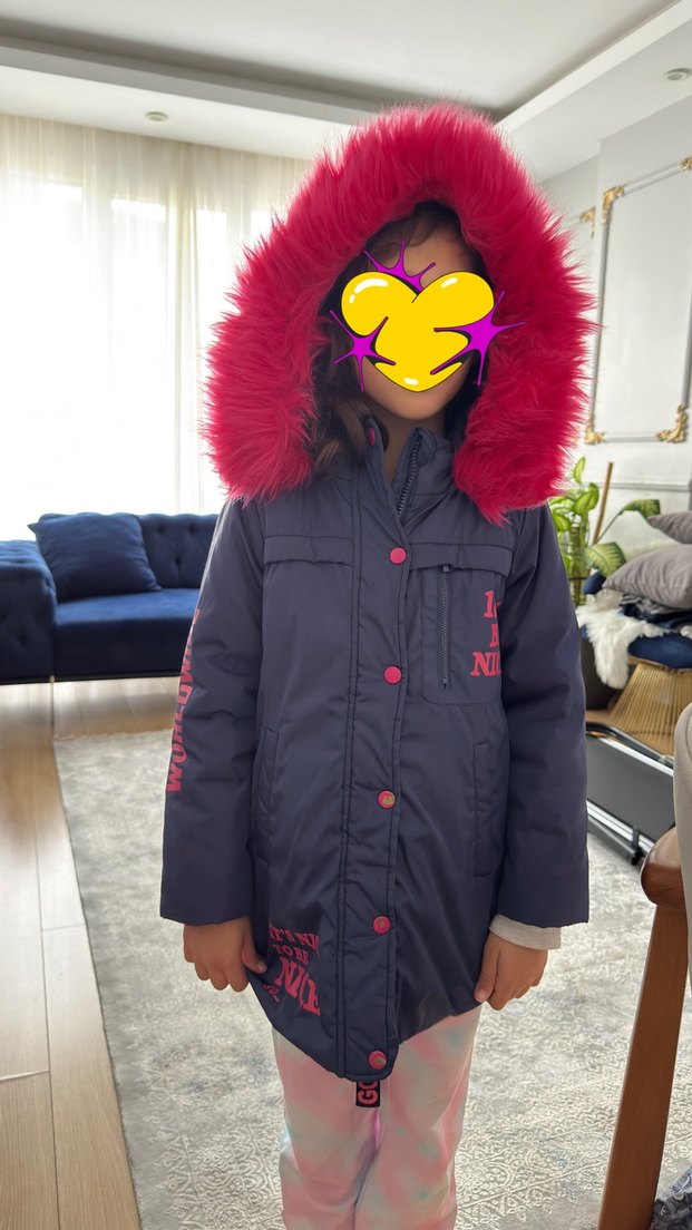 Kız çocukları için kürklü kapüşonlu, baskılı detaylı gri mont. Notlu yaka ve soft, sıcak kumaşla sokak stili için uygun.