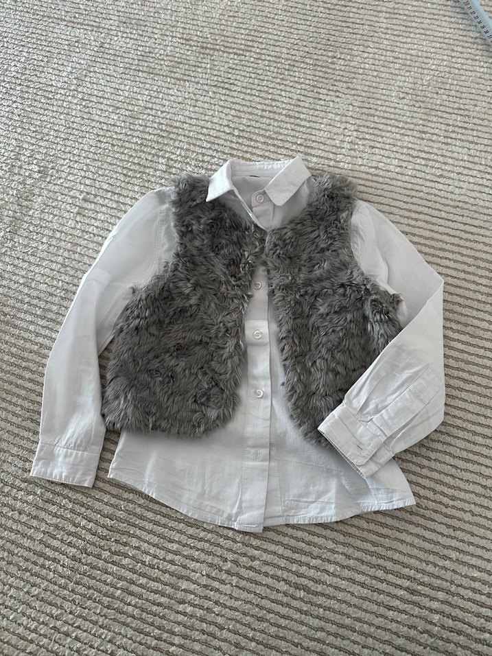 4-5 yaş Gri renk, kürk detaylı, kolsuz, yakalı ve fit kesim kız çocuk yeleği, yumuşak keten kumaştan üretilmiştir. Herhangi bir sorunu yoktur. #yelek #kürkyelek