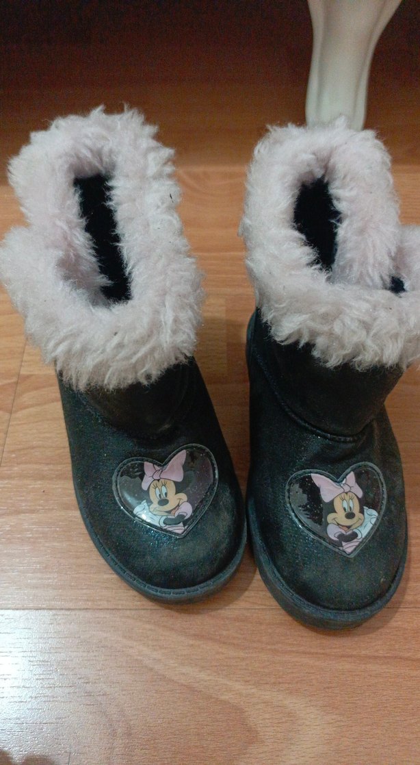 Gri renkli, yumuşak kürk detaylı ve nakışlı Minnie Mouse figürlü kız çocuk botları, gündelik goth tarzında.