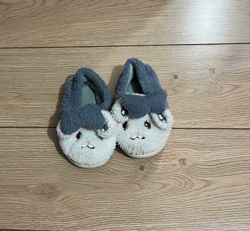 Kız çocukları için gri renkli, kürklü ve nakışlı sevimli hayvan yüzü detaylı sıcak ev terlikleri.