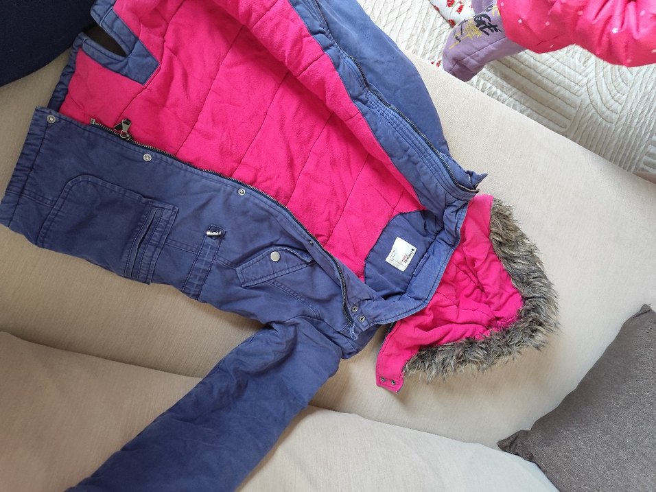 Kız çocuk montu, kürk detaylı ve yakası kesik. İç kısmı yumuşak pembe astarlı, dışı gri renkte, rahat ve şık bir tasarım sunar.