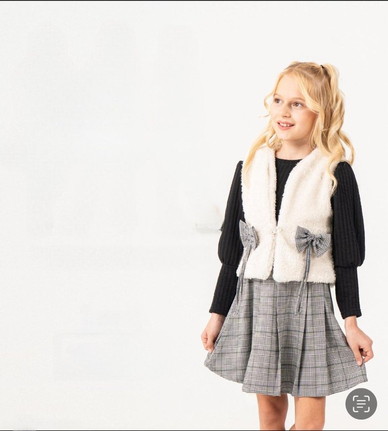 Kız çocuk için salaş kesim, kolsuz ve yumuşak, sıcak kumaştan yapılmış kürk detaylı yelek. Gri tonlarında bağlama desenli ve straplez yakalıdır. etekli ve üst olarak 3 parçadır. EKOSE ETEKLİ PELUŞ YELEKLİ 3LÜ KIZ TAKIM 6 7 8 9 yaşları mevcuttur