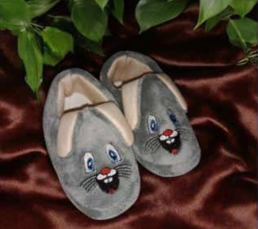 Kız çocukları için kürklü detaylı, yumuşak ve sıcak kumaştan gri ev terliği, sevimli hayvan yüzü desenli.