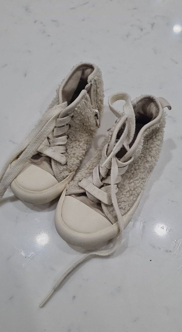 Beyaz ve gri renklerde, kürklü detaylı ve yumuşak kumaştan yapılmış kız çocuk sneakers, trend sokak stili için uygun.