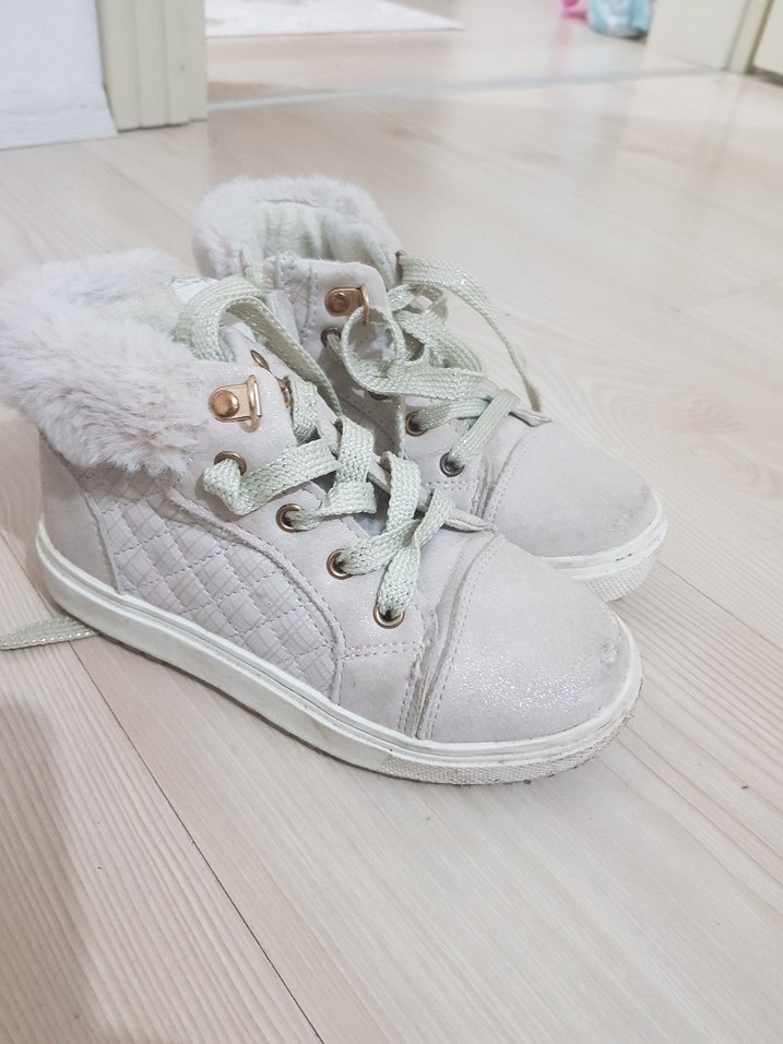 Gri renkli, kürklü detaylı ve yumuşak kumaştan üretilmiş kız çocuk spor botları, sokak stiline uygun ve rahat bir tasarıma sahiptir.