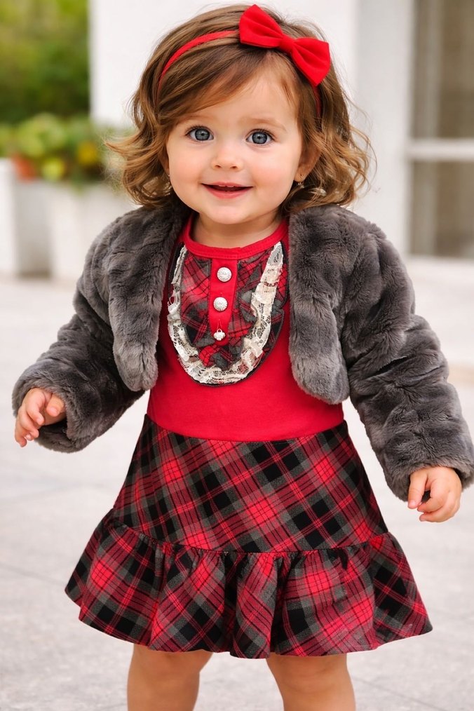 Gri kürk detaylı, uzun kollu ve fitted kesime sahip kız çocuk elbisesi. Yaka kısmı yakalı, etek kısmı kırmızı-siyah ekose desenlidir. penye elbise ekoseli yeri pamuklu kumaştır oduncu gömlek kumaşı tarzında iç astarı pamuklu penyedir elbise boyu:52cm kol:36cm bolerokol:36cm
