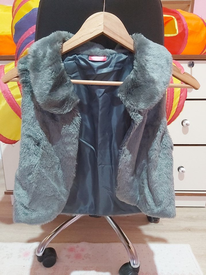 Gri renkli, kürklü detaylı, kolsuz kız çocuk yeleği