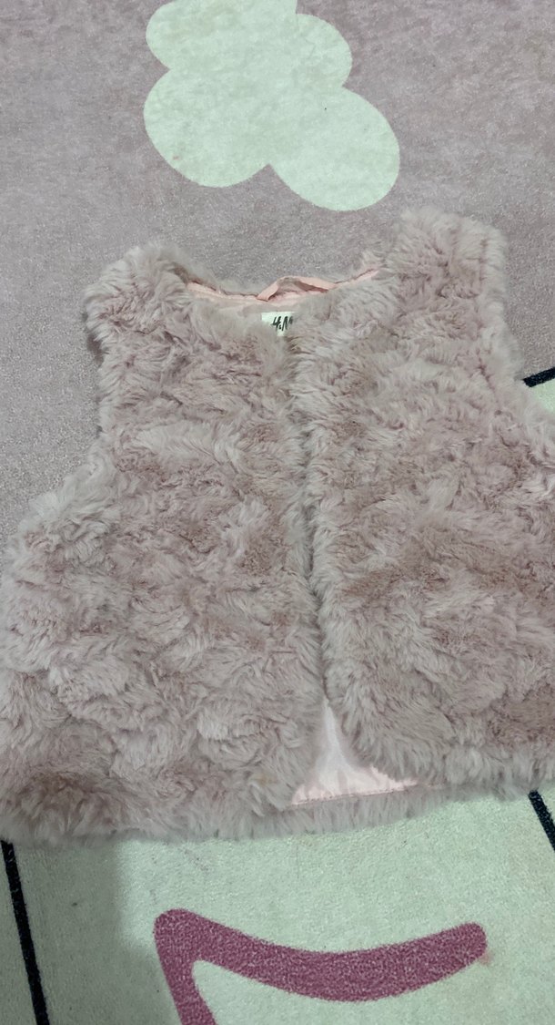 Kız çocuk için pastel gri renkte, yumuşak kürk detaylı, straplez ve kolsuz, dar kesim yelek. Sokak stili için uygun. Pudra pembesi