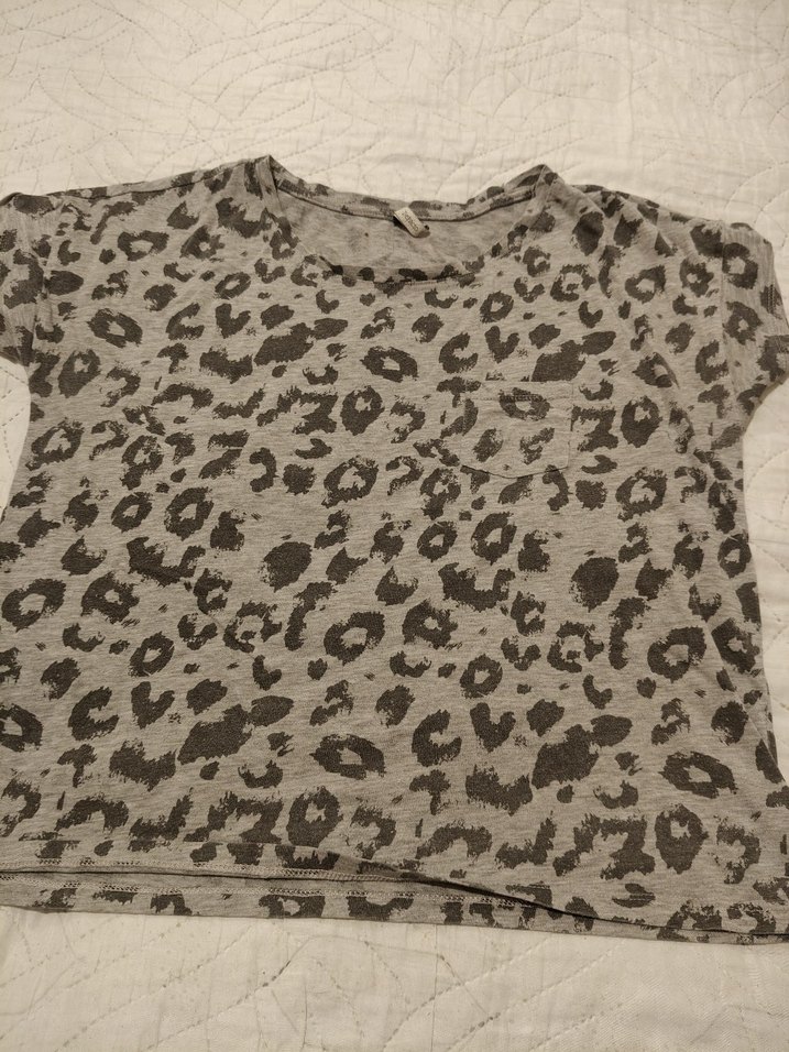Yumuşak keten kumaştan, kısa kollu, yuvarlak yakalı ve leopar desenli örgü kız çocuk tişörtü, rahat ve salaş kesimle sokak stiline uygun.