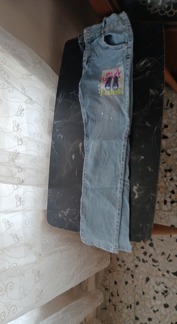 Kız Çocuk Gri Mavi Bağlama Desenli Denim Pantolon