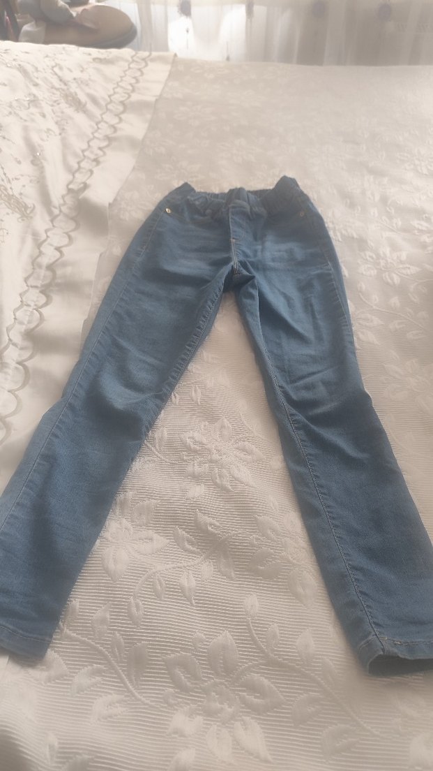 Gri mavi tonlarında, bol kesim kız çocuk denim pantolon. Desensiz, rahat ve şık bir görünüm sunar.
