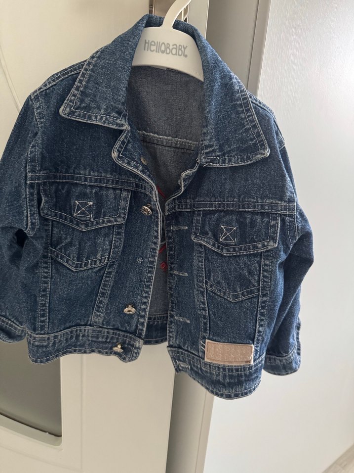 Gri mavi tonlarda kot kumaştan yapılmış, düğmeli ve kesik yakalı bol kesim kız çocuk ceketi. Trend sokak stili için uygun.