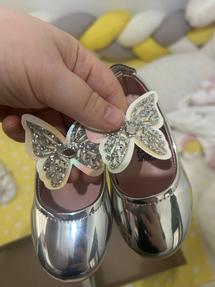 Kız çocukları için parlak gri metalik yüzeyli, baskılı desenli ve fiyonk detaylı babet sadece kelebekli ufak bir kopukluk var başka bir sorunu yok