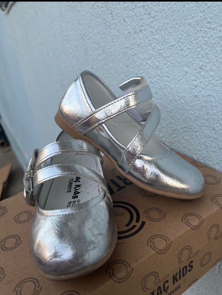 Kız çocukları için gri metalik tokalı babetler, sade ve deseniz tasarıma sahip, sokak stiline uygun rahat ayakkabılar.