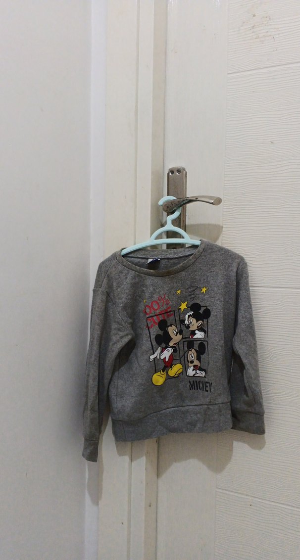 Kız çocuk için uzun kollu, bisiklet yaka, bol kesim gri renkli, yumuşak kumaşlı, Mickey baskılı ve cırt cırt detaylı sweatshirt.
