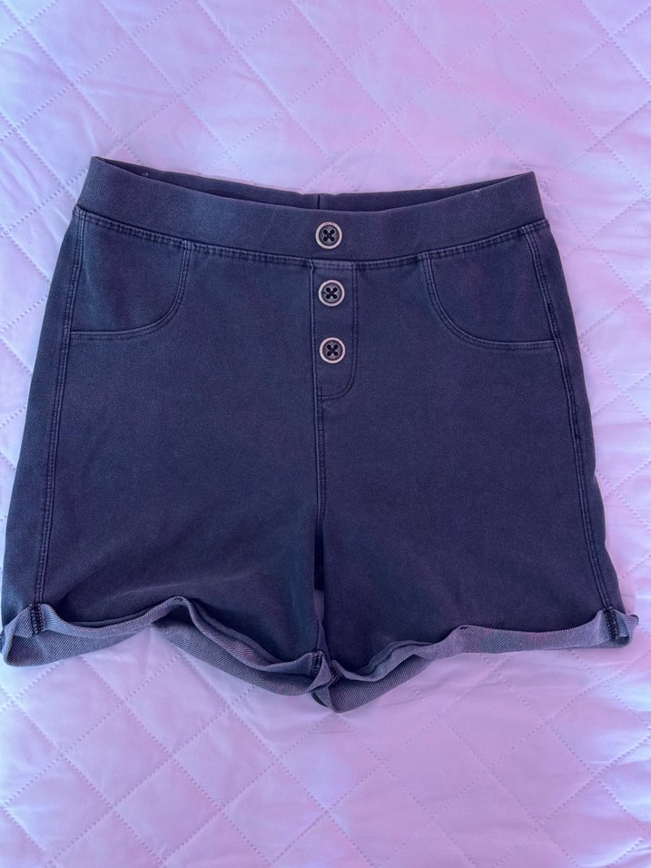 Kadınlar için düğmeli ön detaylı, kısa ve mini uzunlukta gri denim şort. Günlük ve sokak stiline uygun rahat kesim.