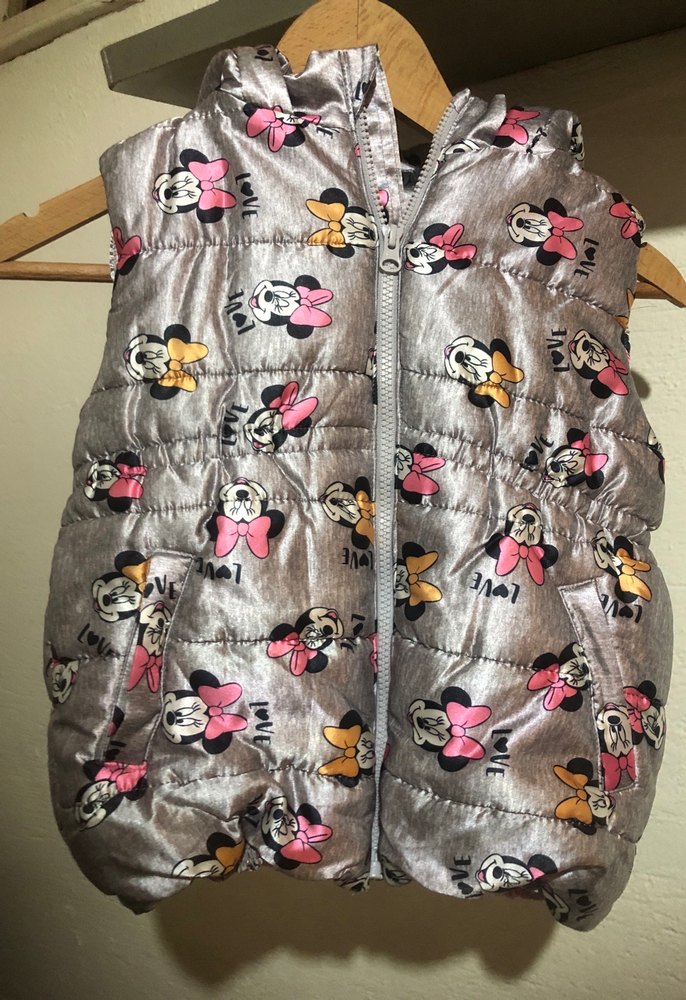 Fermuarlı, straplez kesimli kız çocuk yeleği, gri sentetik kumaş ve renkli Minnie baskılarıyla trend bir tarz sunar.
