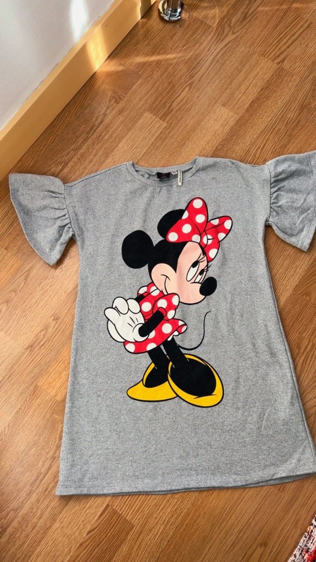 Gri renkte, bol kesim, kısa fırfırlı kollu kız çocuk elbise Minnie Mouse baskılı, yumuşak sentetik kumaştan yapılmıştır. Minik bi kusuru vardır.giyime engel değildir.