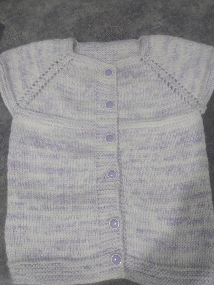 Kolsuz, bol kesim kız çocuk hırkası yumuşak örgü kumaştan yapılmıştır. Mor ve gri tonlarının sade karışımı, ön düğmeli tasarım içerir.