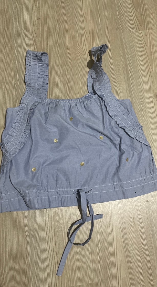 Gri nakışlı detaylara ve fırfırlı askılara sahip kız çocukları için bol kesim denim bluz. Kolsuz ve rahat sokak stili görünümünde.