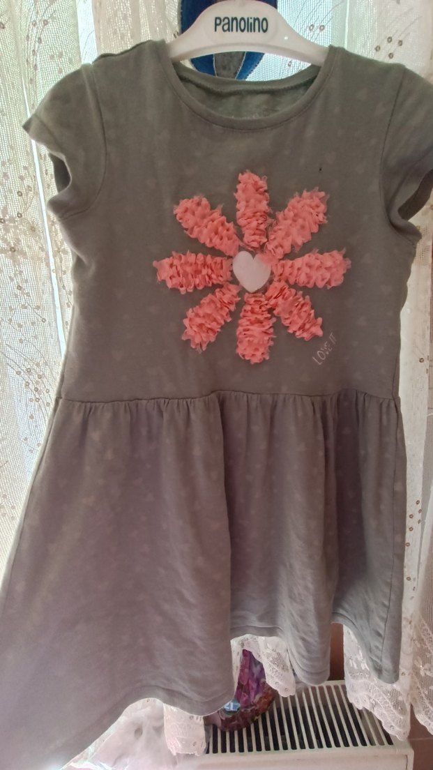Gri, fırfırlı pembe nakışlı çiçek detaylı, kolsuz, salaş kesim ve yuvarlak yaka elbise. Yumuşak dokulu kumaş, bohem tarzı. fotoğrafta eklediğim yerde ufak iki delikten dolayı fiyatını uygun tutuyorum