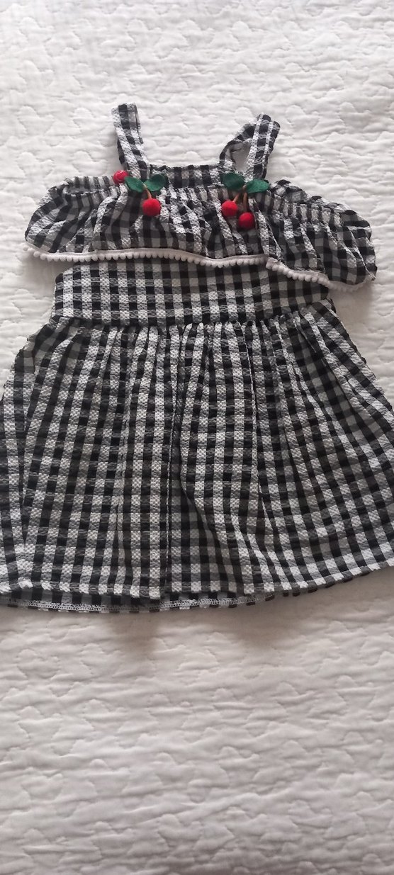 Gri ekose desenli, yumuşak kumaştan yapılmış, nakışlı kiraz detaylı, fırfırlı omuzları açık kız çocuk elbisesi.
