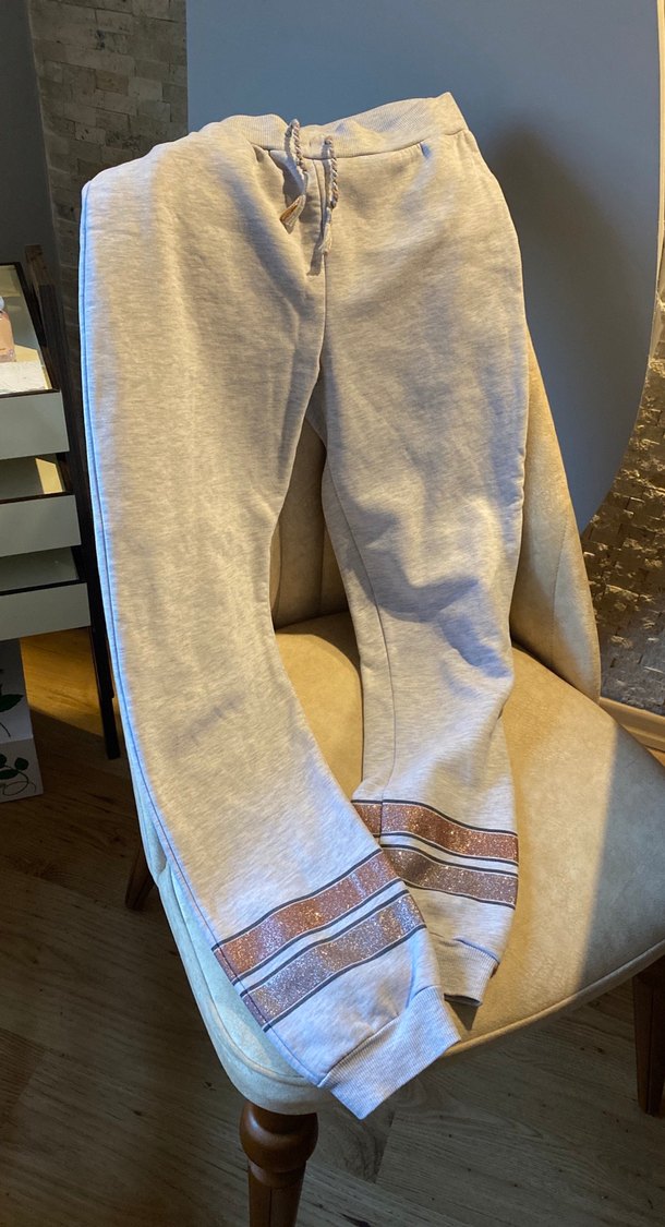 Gri renkte, nakışlı ve tokalı detaylara sahip, bol kesim kadın eşofman altı.rahat ve günlük kullanıma uygun.