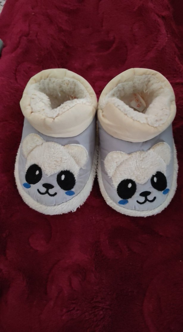 Gri renkli, nakışlı panda desenli ve kürk detaylı kız çocuk terlikleri, yumuşak ve sıcak iç yüzeyiyle rahatlık sağlar.