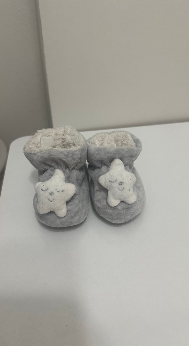 Gri renkli, nakışlı yıldız detaylı, yumuşak örme ve sıcak tutan kumaştan kız çocuk terliği. ⭐