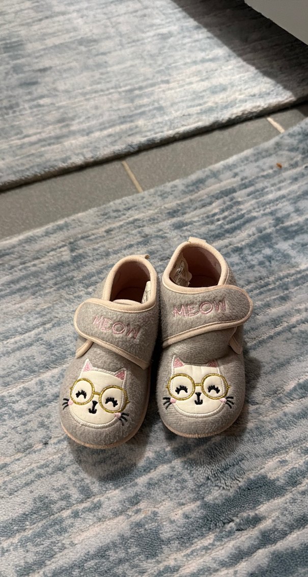 Yumuşak ve sıcak kumaştan, kedi nakışlı ve cırt cırtlı gri kız çocuk terliği.