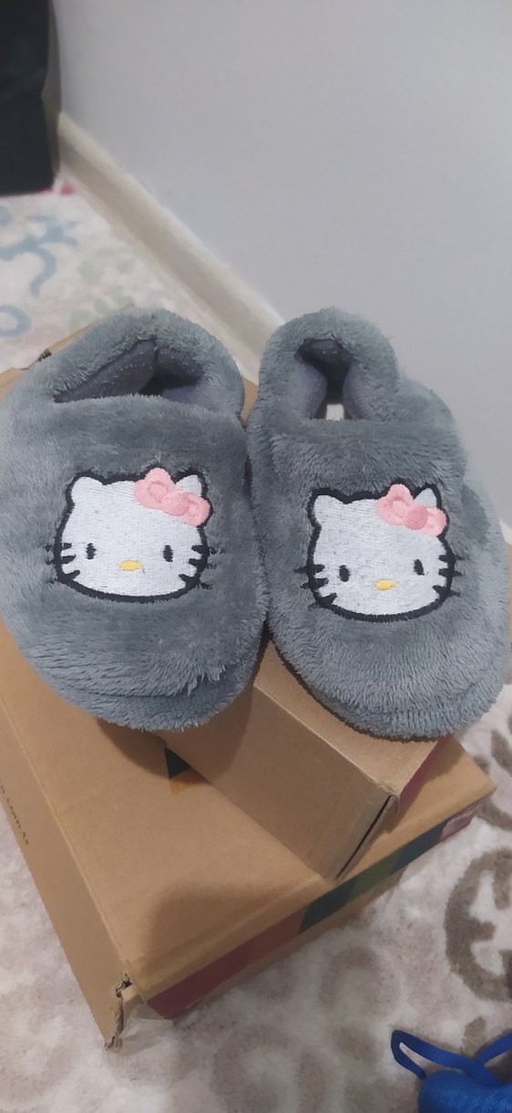 Gri renkte, yumuşak ve sıcak kumaştan yapılmış, kürk detaylı ve nakışlı Hello Kitty desenli kız çocuk terlikleri.