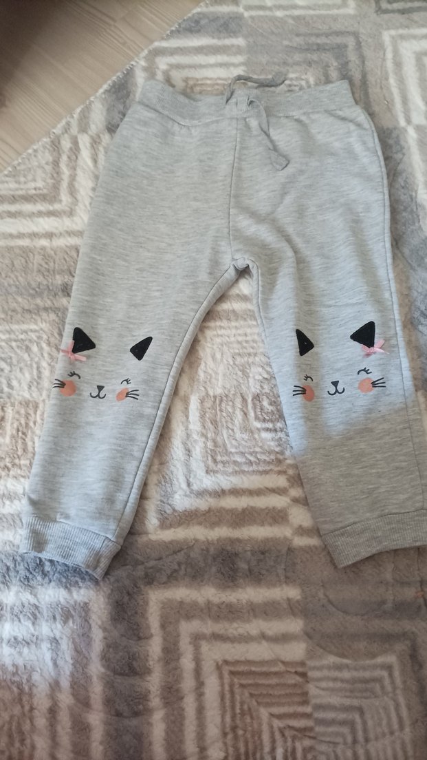 Nakışlı kedi yüzleri ve kürk detaylı, bol kesim gri kız çocuk polar pantolon, günlük sokak stili için uygundur.