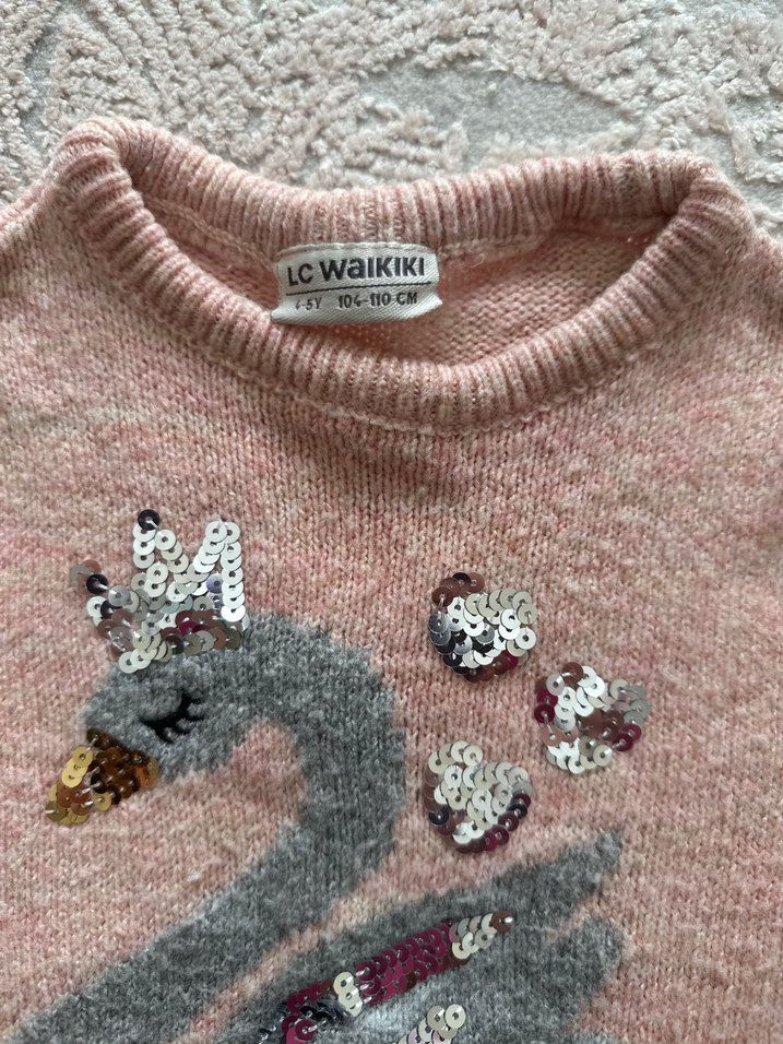 Kız çocukları için, yuvarlak yakalı, uzun kollu, yumuşak triko kumaştan yapılmış, nakışlı ve payet detaylı bol kesim gri kazak. Marka: LC Waikiki.