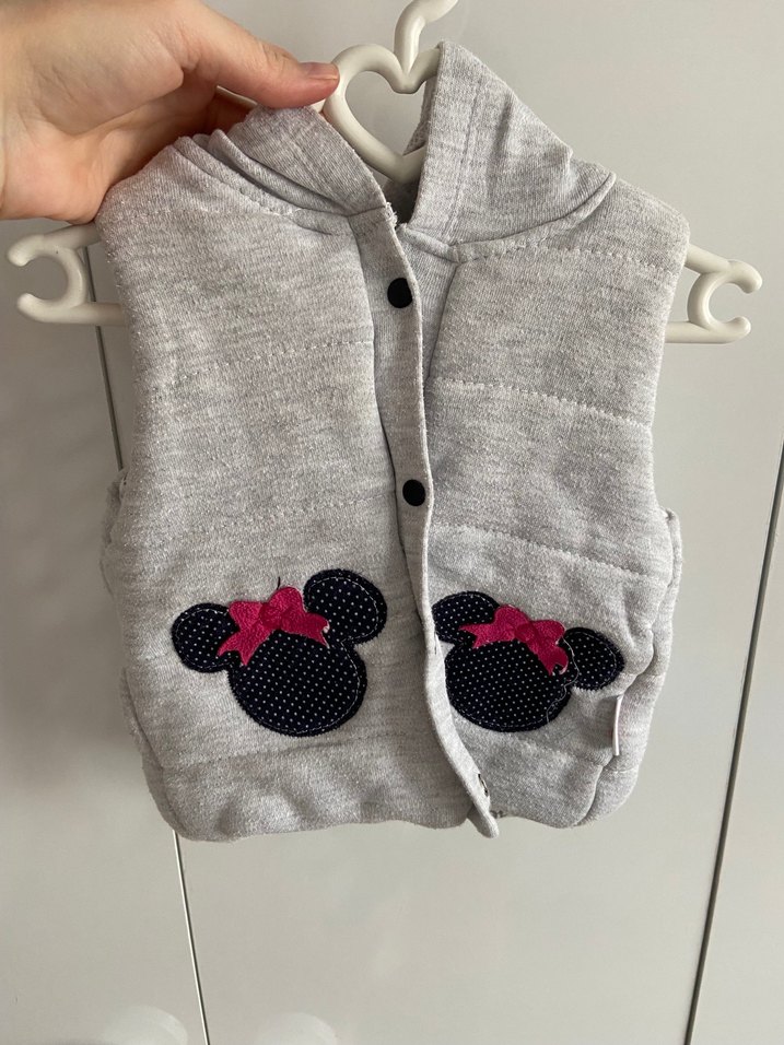 Gri renkli, nakış detaylı, kolsuz şapkalı kalın yelek. Defosu yoktur temiz