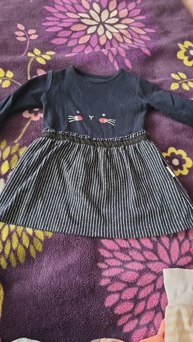 Kız çocuk için uzun kollu, fitted kesim, yuvarlak yakalı, nakışlı ve çizgili etekli gri renkli örme kumaştan elbise. 3 yaş ama dar kalıp
